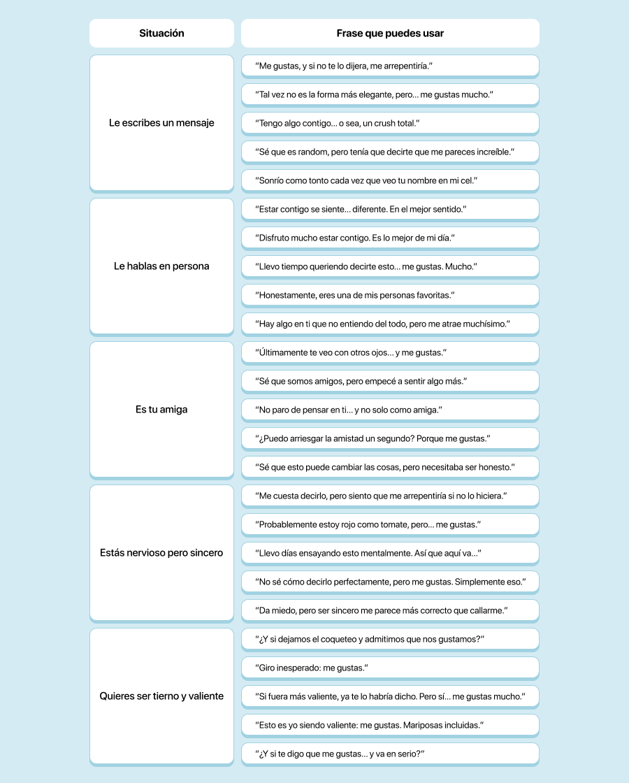 - “Sé que esto sale de la nada, pero siento algo por ti y quería que lo supieras.”