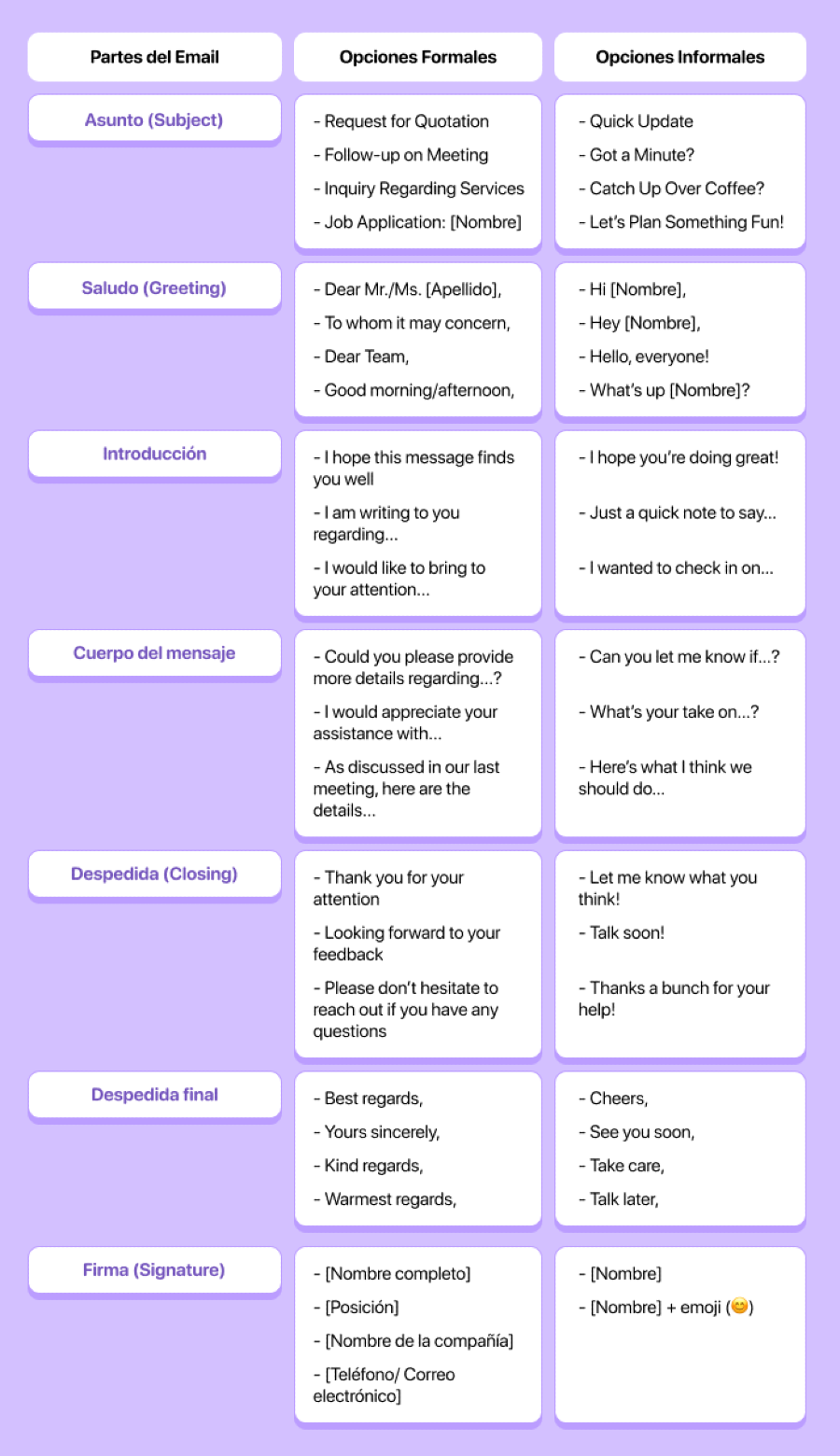 Aquí tienes una tabla que organiza las diferentes partes de un correo electrónico, ofreciendo opciones según el contexto (formal o informal):
