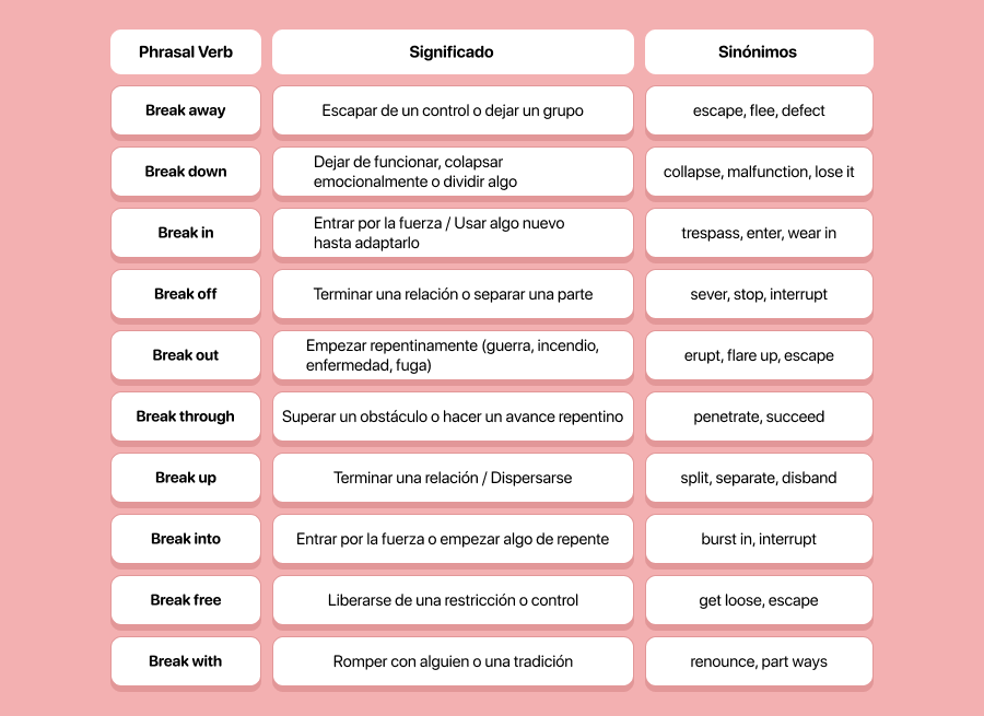 Tabla de referencia rápida: Phrasal Verbs con "Break"