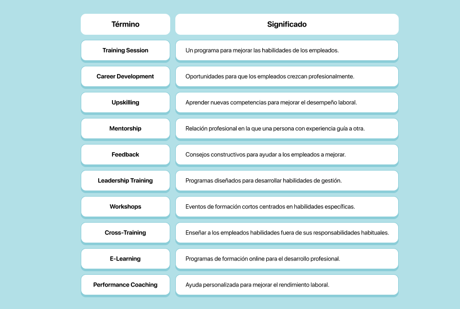 - Capacitación y desarrollo – Conducir sesiones de formación y escribir manuales requiere un sólido dominio del vocabulario de RR. HH.