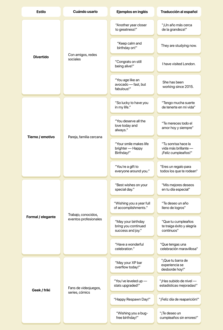 🧭 Tip cultural extra: En algunos países como Estados Unidos y Reino Unido es común regalar tarjetas con bromas o ilustraciones graciosas, mientras que en Japón se valora más un mensaje corto, formal y sincero. Ajustar el estilo a la cultura puede marcar la diferencia.