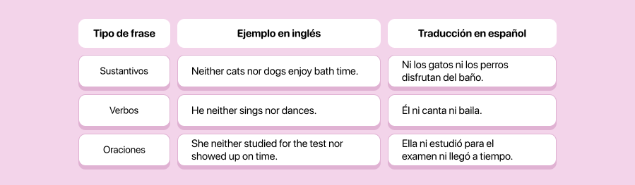 Veamos ahora algunos ejemplos reales de oraciones con neither/nor que puedes usar en conversaciones o textos: