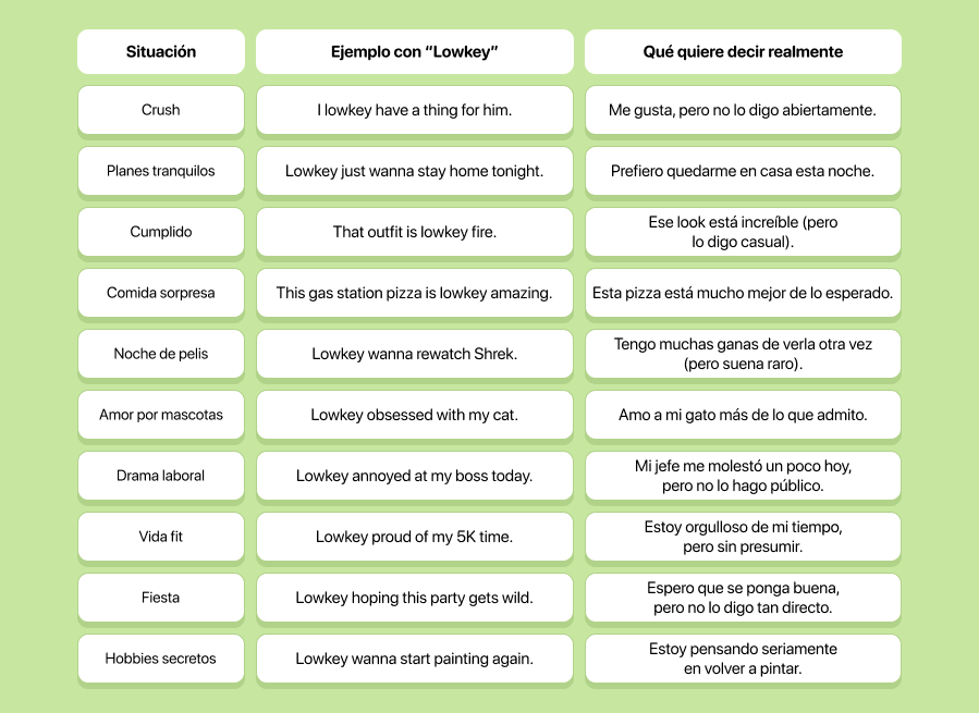 Aquí es donde se pone bueno. Puedes usar "lowkey" en mil situaciones diferentes. Mira esta tabla con un montón de ejemplos para que empieces a usarlo como todo un pro: