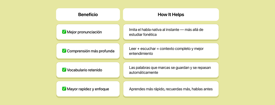 No solo estás repitiendo. Estás involucrando tu vista, oído, voz y memoria a la vez. Es un entrenamiento lingüístico completo.