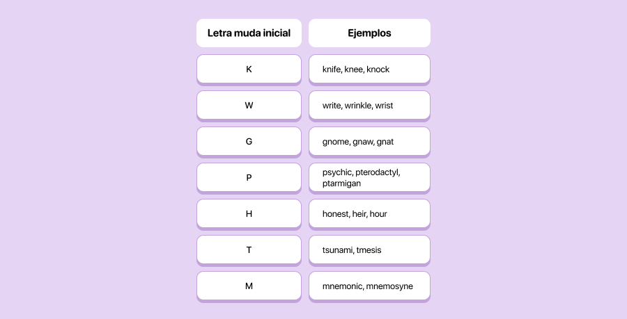 - kn, gn, ps, wr al inicio = letra inicial muda (knee, gnome, psychology, wrist);