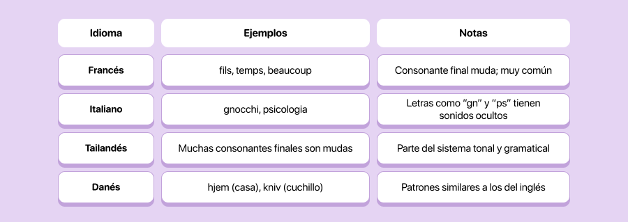 Las letras mudas no son exclusivas del inglés. Aquí tienes algunos ejemplos de otros idiomas: