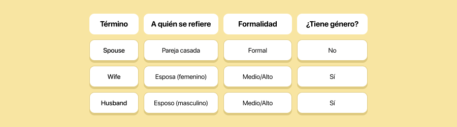 Aunque wife (esposa) y husband (esposo) son mucho más comunes en la conversación diaria, spouse se usa con frecuencia en contextos oficiales, como documentos legales, formularios médicos o trámites fiscales.